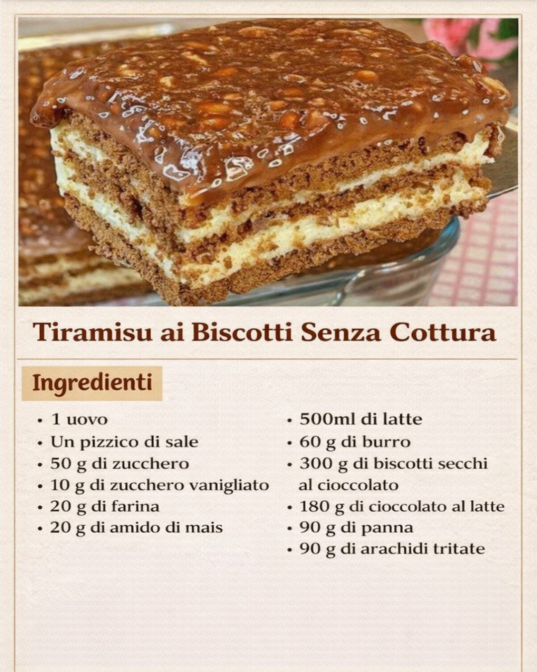 Tiramisù ai Biscotti Senza Cottura Facile, adminonApril 6, 2026Leave a Comment on Tiramisù ai Biscotti Senza Cottura Facile, Ingredienti:Biscotti al cioccolatoLatteCremaCioccolatoPanna Prossimo »»