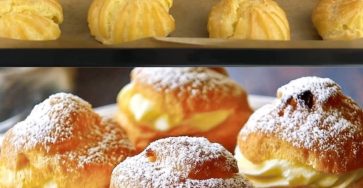 Ingredienti: 80 g di burro 1 tazza (200 ml) di acqua 1 tazza (130 g) di farina 3 uova 2 tuorli d’uovo 3 cucchiai di zucchero 2 cucchiai di amido di mais 250 ml di latte tiepido 2/3 di tazza di panna fresca vedere il seguito alla pagina successiva